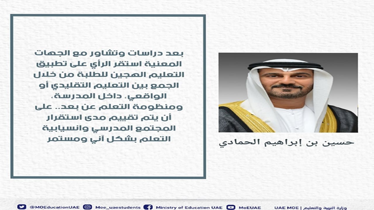 وزارة التربية On Twitter معالي حسين الحمادي بعد دراسات وتشاور مع الجهات المعنية استقر الرأي على تطبيق التعليم الهجين للطلبة من خلال الجمع بين التعليم التقليدي أو الواقعي داخل المدرسة ومنظومة التعلم